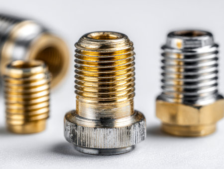 An intricate brass fitting with threading details is complemented by other metal connectors, highlighting precision craftsmanship and robust industrial plumbing tech