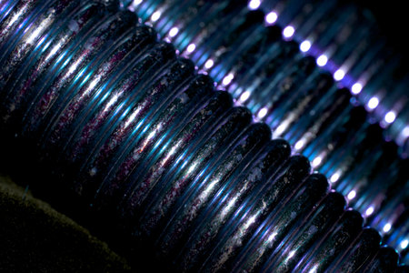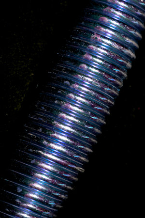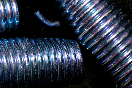 A close-up of the thread of a black bolt with whitening ribs of a spare part in an auto service as a background for publication in a thematic men's magazine.
