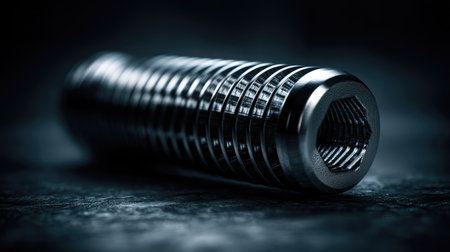 This close-up image features a metallic bolt resting on a dark surface, showcasing intricate textures and reflections. Ideal for industrial themes.