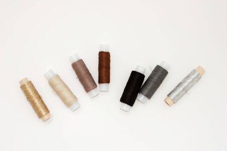 Flat lay colorful cotton thread spools, embroidery yarn, white, brown, gray, black, silver, gold bobbins, mock up, top view. Layout mockup, blank white background for needlework, sewing poster, banner