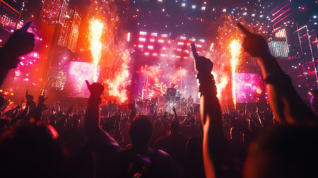 Crowd cheering at a vibrant concert with fireworks and lights in an outdoor venue at night