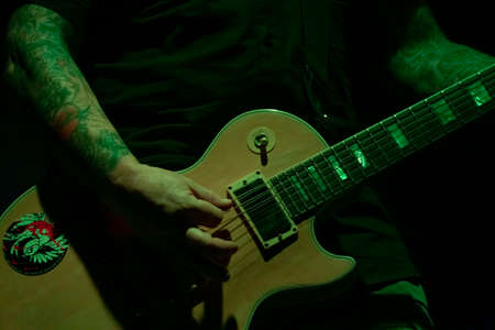 Man playing on electric guitar during gig. Musical instrument. Teenage boy having music hobby.