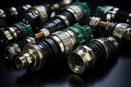Close up of metal connectors joining shielded cables, ensuring a robust and secure connection for transmitting data or power, highlighting precision engineering and industrial design