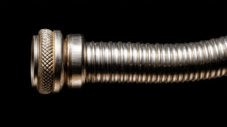 This image showcases a close-up of a metallic flexible hose featuring intricate details and a shiny surface against a black background, highlighting craftsmanship.