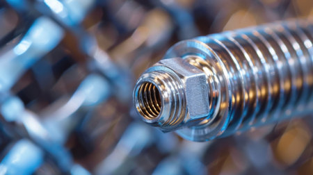 A close-up view of metallic fasteners and threads on industrial machinery showcases intricate details and textures, perfect for engineering and manufacturing themes.