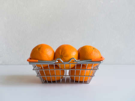 Fresh ripe mandarin oranges fruit or tangerines in small metal food basket on grey background