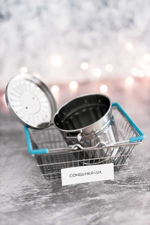 consumerism conceptual image, shopping basket symbol of good to be purchased with recycling bin symbol of excess goods being produced or bought with labels