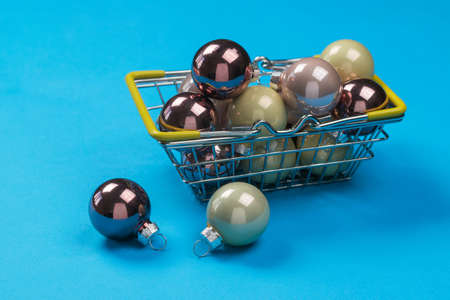 Metal basket with glass balls for Christmas tree on a blue background. Meeting of Christmas and New year.