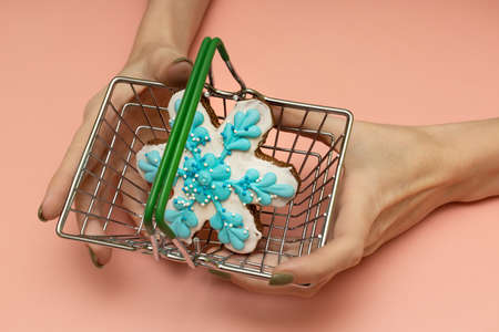 hand holds a basket in which lies a gingerbread in the shape of a snowflake. high quality photo