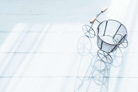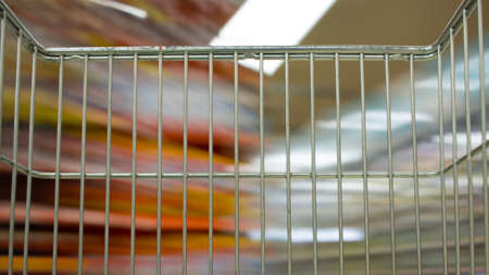 Empty metal shopping basket. Concept of consumerism, shopping symbol. Copy space trend pastel color. Hard shadows, morning light.