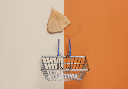Autumn shopping. Shopping basket with fallen autumn leaves on brown beige background. Top view