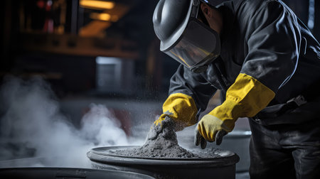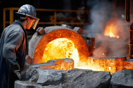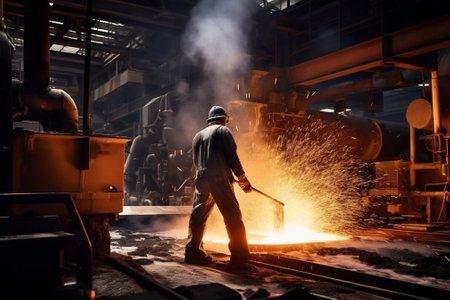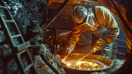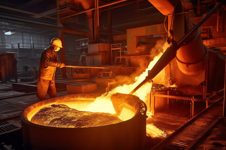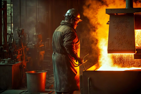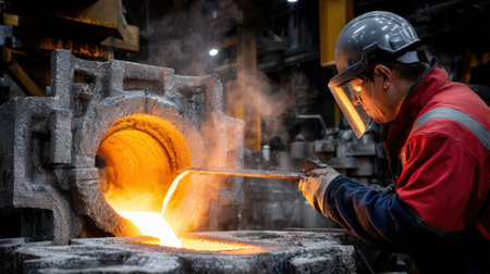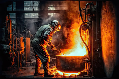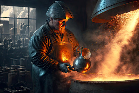 foundry worker, pouring molten metal into mold, created with generative ai