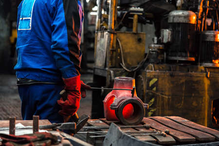 Close-up view of industrial chill casting. The process of for filling out mold with molten metal.