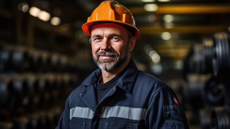 Portrait of a mature Caucasian male worker in a hardhat standing in a warehouse.