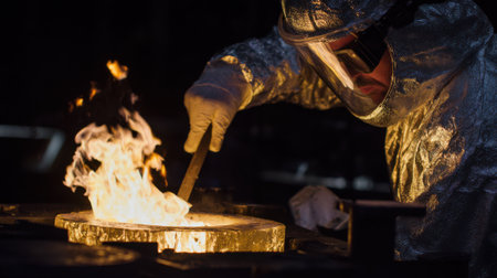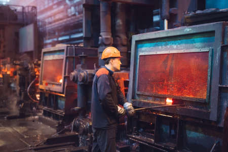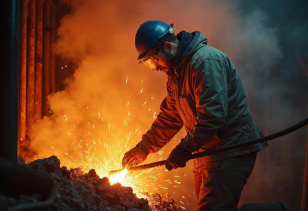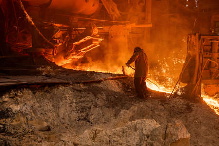 A man in a red jacket is working with molten metal in a factory. Concept of danger and risk, as the man is working with extremely hot materials and wearing protective gear
