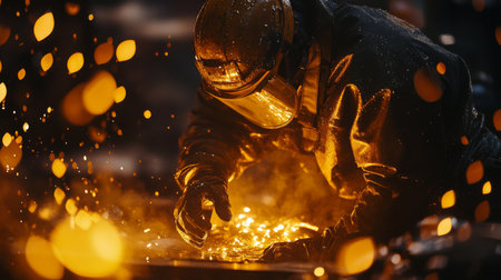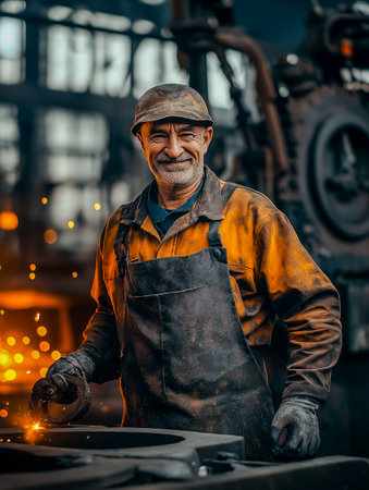 In a vibrant steel mill, a dedicated worker expertly handles molten metal, creating brilliant sparks amidst glowing orange hues. The atmosphere is charged with energy and labor's artistry.