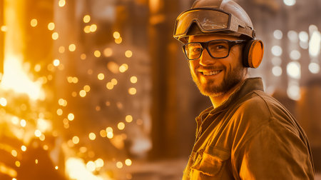 A man in a protective suit stands in front of a furnace with a yellow glow. Concept of danger and caution, as the man is wearing a hard hat and safety glasses to protect himself from the heat