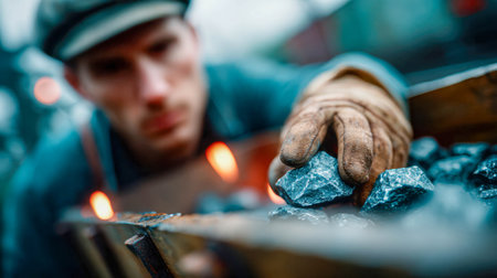 Focused male worker in cap and jacket handling coal at an industrial site with determination.
