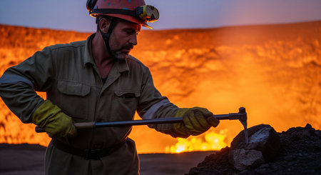 Volcanologist in protective gear working with a pickaxe near a molten lava flow at dusk. He is a scientist studying a volcano eruption.