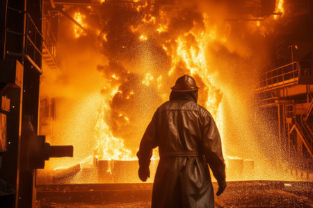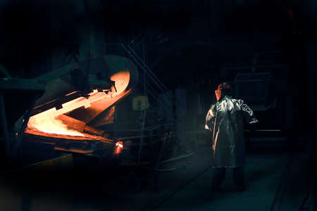 a steel worker in heat protective clothing stands near liquid iron or steel at a blast furnace