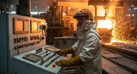 A steelworker wearing a heat-resistant suit and protective helmet operates a large control panel in a steel mill. In the fiery background, a shower of sparks erupts from molten metal, depicting the intensity of heavy industry and manufacturing.