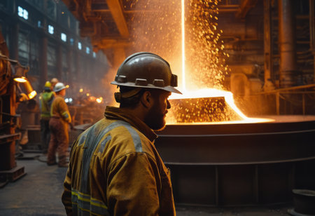 A steelworker oversees molten metal pouring. Protective gear and intense heat dominate the scene.