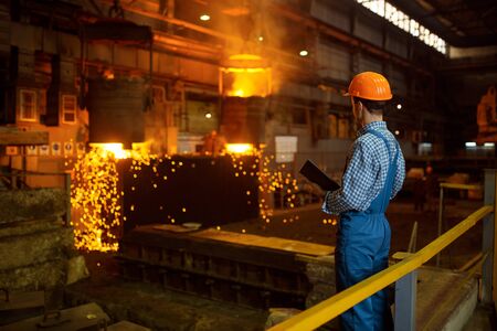 Master steelmaker in helmet at furnace with liquid metal, steel factory, metallurgical or metalworking industry, industrial manufacturing of iron production on mill