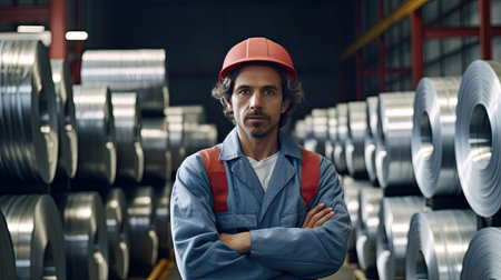 Portrait of Worker with Rolls of galvanized steel sheet inside the factory or warehouse. Generative Ai