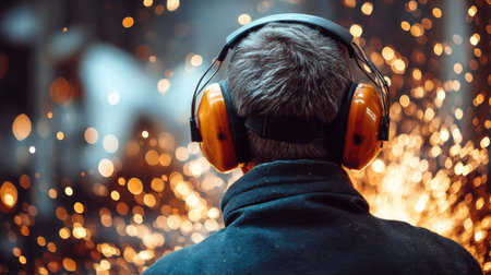 Protective earmuffs worn by a welder with sparks flying in the background, showcasing safety in action