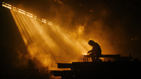 A captivating silhouette of a welder in an industrial setting, framed by stunning light rays and smoke, illustrating the beauty of craftsmanship and dedication in labor.