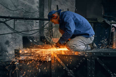 Close up of young man in blue special uniform doing gate by electric steel cutter machine for welding special metal. Concept of process produce modern fence in garage.
