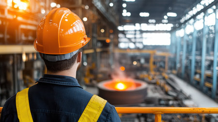 engineer in uniform and hard hat, showing expertise at a bustling steel manufacturing facility.