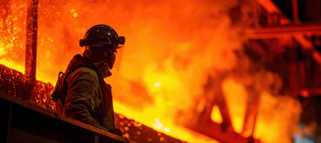 Worker in a steel mill overseeing molten metal pouring, surrounded by intense flames.
