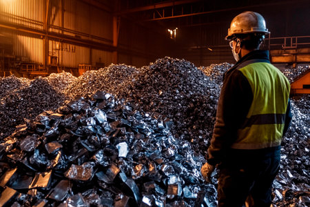 Under the glow of industrial lights, a worker stands before towering mounds of processed metal, reflecting the hard labor of the day amid the vibrant energy of the facility.