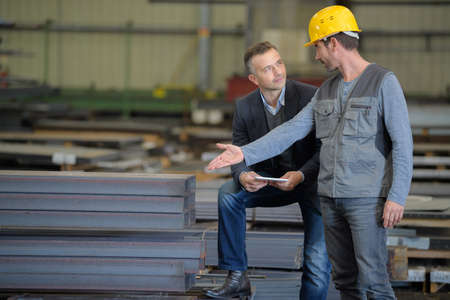 Two skillful factory engineer or worker showing teamwork and partnership . Industrial people and manufacturing labor concept .