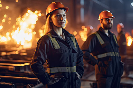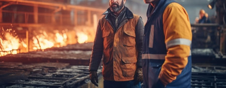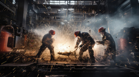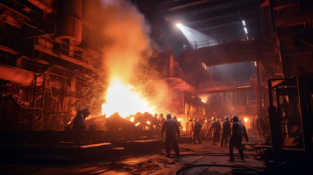 Generative AI, heavy industry backdrop, and workers in a factory with metal casting molds at a metallurgical steel mill