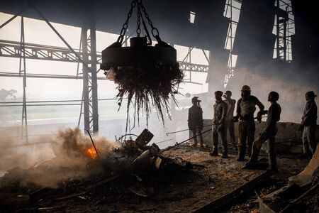 Workers at metallurgical plant. Working with scrap metal. Metal manufacturing and recycling factory.