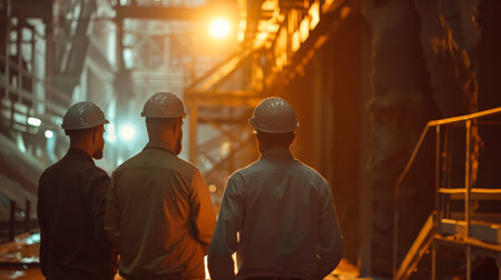 Rear view of two factory workers in hardhats looking at each other, Industrial workers full rear view working on Industrial space, AI Generated
