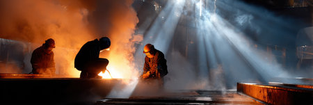 Three men are working in a factory with smoke and steam. Scene is intense and dangerous, as the workers are in a hazardous environment