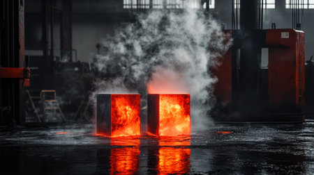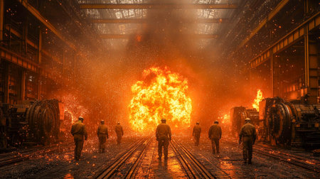 Dramatic scene of molten steel explosion inside an industrial steel plant with blazing fire.