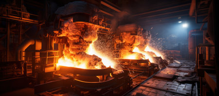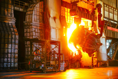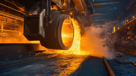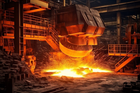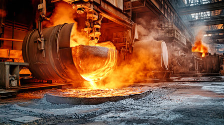 Image of molten metal being poured from an industrial furnace in a steel production factory, showcasing intense heat, smoke, and the intricacies of manufacturing.