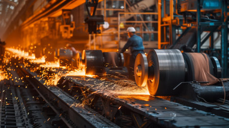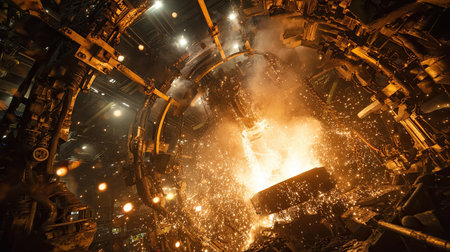 Metal Processing Sparks. A worker in protective gear oversees molten metal being processed, surrounded by flying sparks and glowing materials.