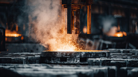 A captivating scene of molten metal in an industrial foundry, showcasing bright sparks and thick smoke against a dark factory backdrop, highlighting the energy of metalworking.