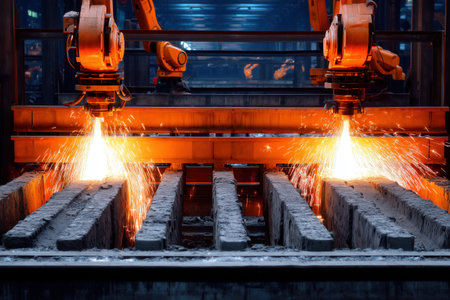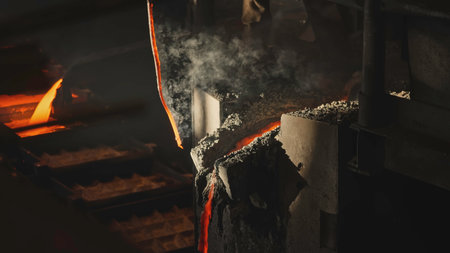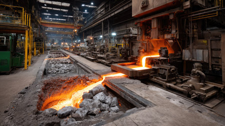 A mesmerizing view of molten metal flowing through casting channels in a modern industrial steel mill, showcasing the intricate manufacturing process.
