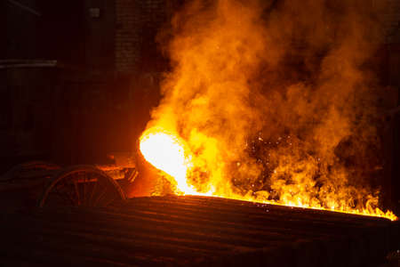 Blast furnace, cast iron production. Metal poured out of the metallurgical furnace