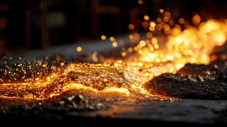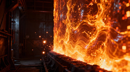 The fiery glow of molten metal creates an abstract and dynamic visual in this industrial setting