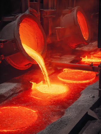Molten steel cascades into precision molds amid intense heat and fiery glow, capturing the dynamic essence of metalworking in a high-temperature foundry.