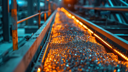 Metallic Ore Being Transported on a Bright Conveyor Belt in a Busy Industrial Facility During Nighttime Operations. Generative AI