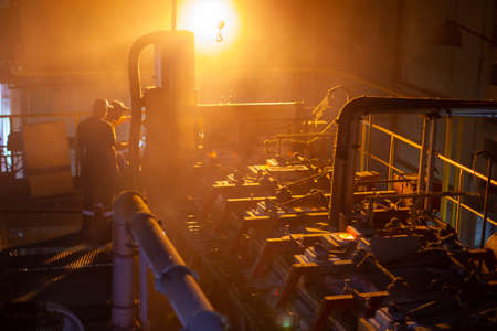 Rolled metal factory. Hot iron slab moving on conveyor of metal rolling mill.