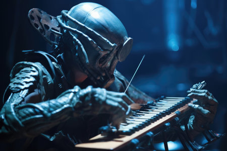 close-up of alien musician playing futuristic, otherworldly instrument during riveting performance, created with generative ai